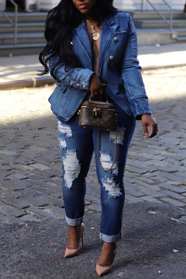Denim Button Up Pocket Turndown Collar Long Sleeve Jacket Blazer