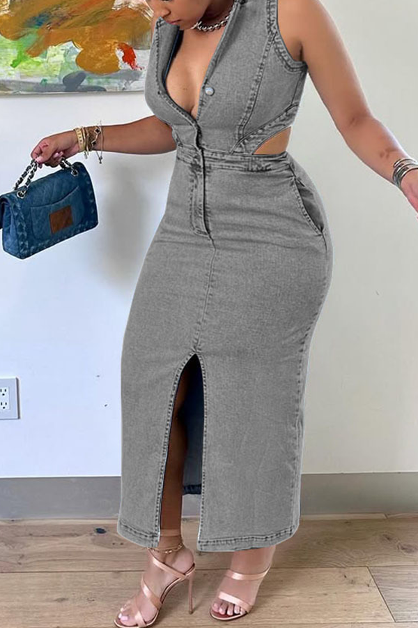 Denim Turndown Collar Sleeveless Cutout Slit Hem Maxi Dress