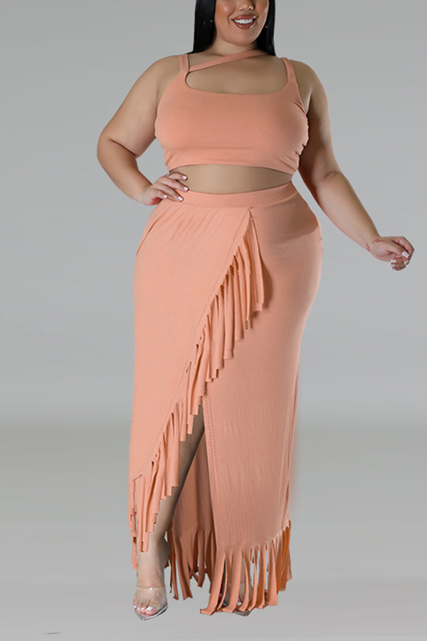 Plus Size Asymmetrical Shoulder Straps Crop Top & High Slit Tassel Hem Maxi Skirt Two Piece Outfits