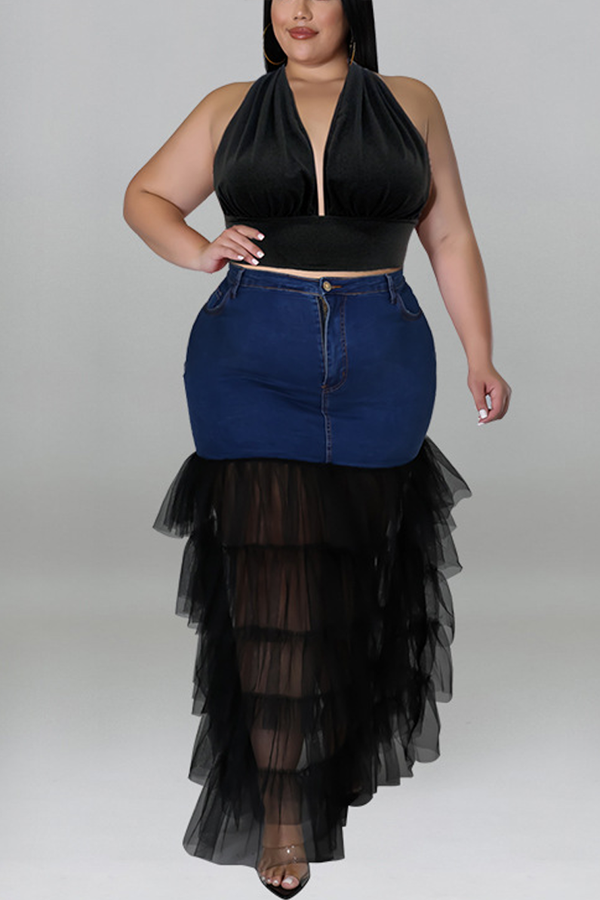 Plus Size Black Top & Mesh Stitching Denim Long Skirt Set
